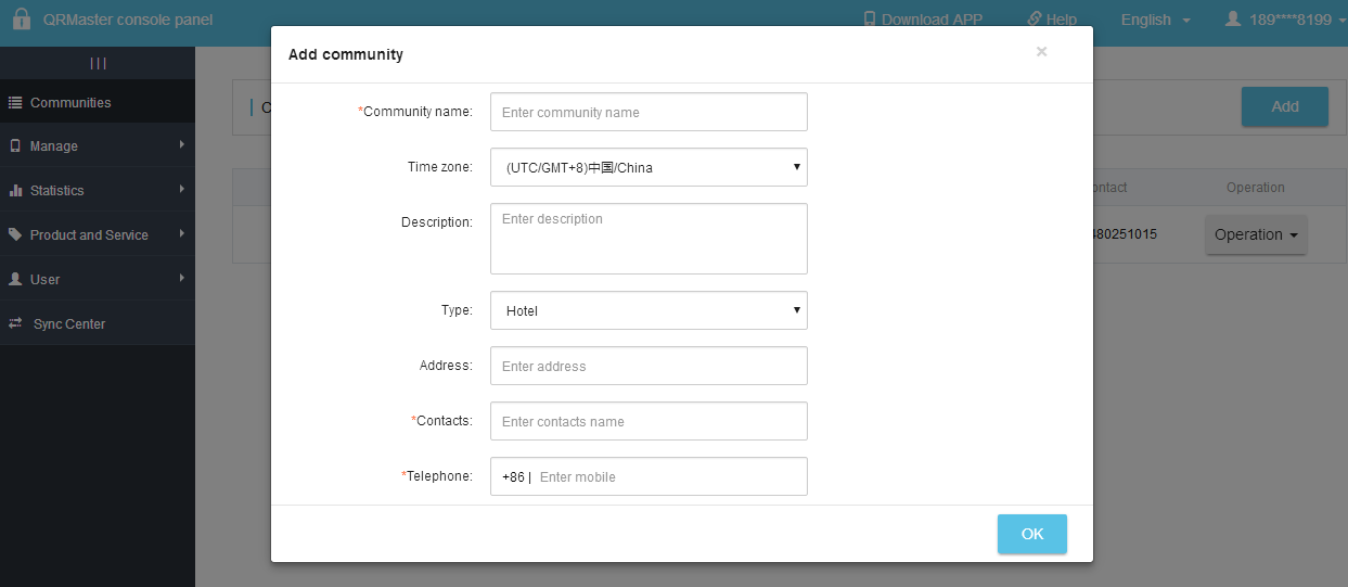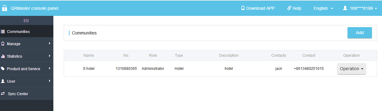 QR Master management includes 'community', 'management', 'statistics', 'product & service' , 'micro community' , 'user center', and 'synchronization center'.