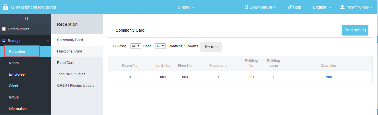 Choose roomManage => Issue/Print => Commonly Used Card => Choose building => Floor => Room.
